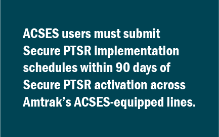 Amtrak has implemented Secure PTSR across its Northeast Corridor ACSES rail operation centers and has begun deploying the solution across its ACSES-equipped fleets. Regional operators will be next in line. FRA requirements state that ACSES users must have a Secure PTSR implementation schedule in place within 90 days of Amtrak completing Secure PTSR activation across all of Amtrak’s ACSES-equipped lines. Amtrak activated its final line on September 17, 2024.