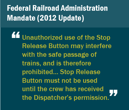 FRA recently modified the Advanced Civil Speed Enforcement System (ACSES) requirements. Dispatcher confirmation is now necessary when using the Stop Release Button to override PTC enforcement of a Stop Signal. Using a multi-step authentication system, engineers who do not receive explicit permission from a dispatch center will not be able to independently override the Stop Signal enforcement. The Secure PTSR functionality will apply in situations of signal-system failure or operational anomalies.