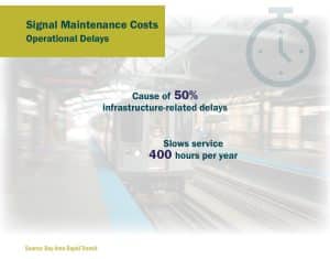Legacy signal maintenance also involves significant operational costs. An in-service failure (ISF) occurs when a train is forced to come to a stop due to a track or equipment defect. U.S. railroads experience thousands of equipment-caused ISFs per year — sometimes caused by an event as simple as a burned-out signal light. For many subway services, signal problems are among the leading causes of delays.