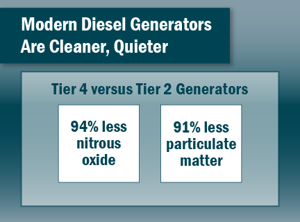 Modern units pollute significantly less than older models. Tier 4 generators emit 94 percent fewer NOx and 91 percent less particulate matter than Tier 2 engines. Still, any diesel-fueled generator contributes to local smog, exacerbating asthma, lung disease, and other health conditions. Particulate matter produces black carbon, a greenhouse gas and toxic air contaminant.