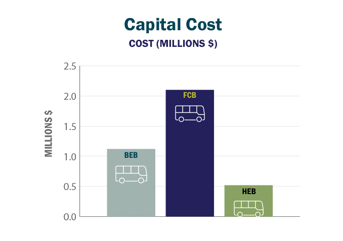 Added to the total capital cost, our analysis finds that FCBs have the highest life-cycle cost. Between BEBs and HEBs, the cost difference is relatively insignificant.