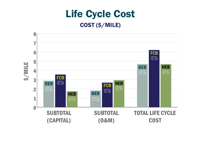 When analyzing ZEV options, Burns compared the life-cycle cost of BEBs and FCBs to hybrid-electric bus (HEB) alternatives. HEBs are powered by an internal combustion engine and an electric motor, using regenerative braking to keep the battery charged.