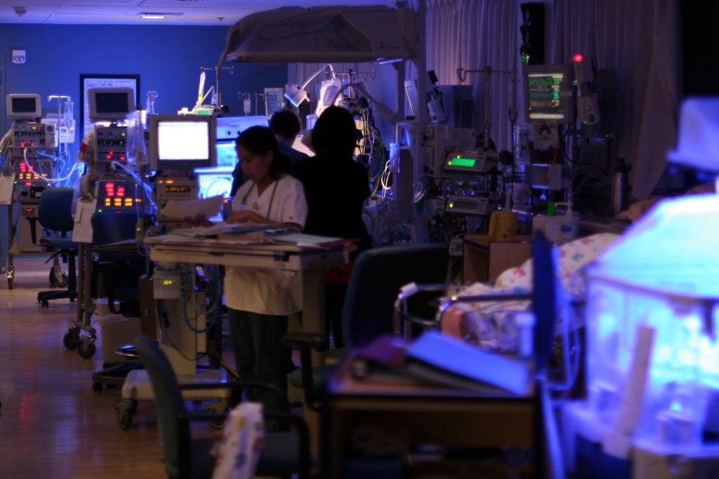 After World War II, evolving hospital standards led many NICUs to stop isolating premature infants, instead grouping them within large rooms. Bright overhead lights stayed on 24 hours a day, enabling medical teams to tell if babies were turning pike or blue. At the time, it was one of the few ways to determine if infants needed oxygen.