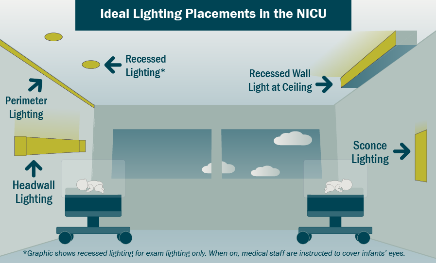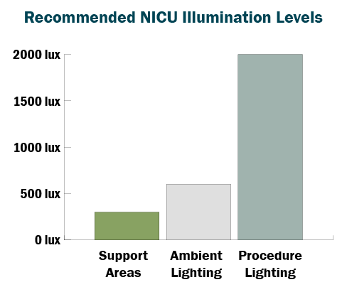 Today, NICU design best practice is to use indirect, diffuse, and adjustable lighting. NICUs are the only critical-care environment where indirect lighting is recommended to achieve ambient illuminance levels.